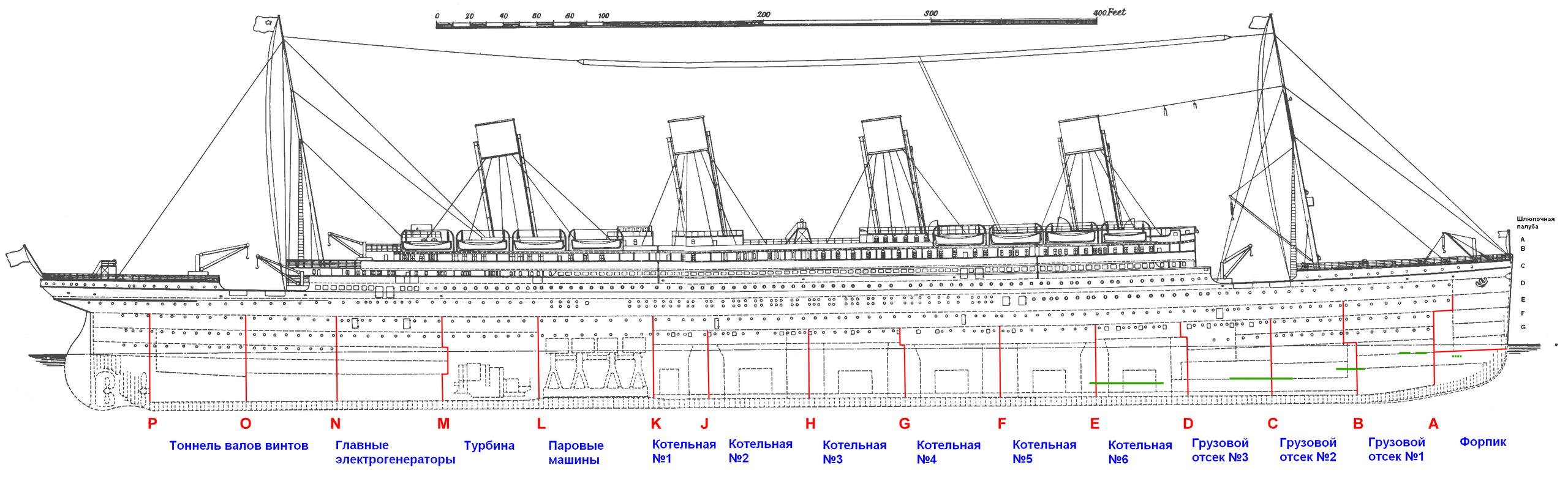 6. Контрзатопление - приём борьбы за живучесть судна, который стал широко использоваться после первой мировой войны. Идея в том, что для судна с водонепроницаемыми переборками дифферент гораздо опаснее, чем набор воды, поскольку дифферент запускает цепную реакцию с переливанием из отсека в отсек. Поэтому дифферента следует избежать любой ценой, и простейший способ это сделать - заполнить водой отсеки с противоположной стороны. Для этого на кораблях стали делать кингстоны. На Титанике кингстонов не было, но был хлипкий борт из шлаковой говностали. Затопление одного-двух кормовых отсеков уменьшило бы скорость набора дифферента, тем самым продлив кораблю жизнь как минимум до прихода Карпатии. Как максимум - насосы в 1, 2 и 6 отсеке стали бы справляться.
