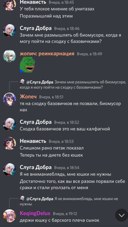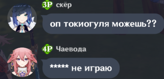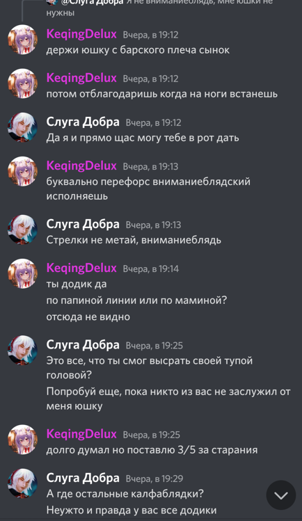 Ты на кого свой львиный зев раззявил чурла ты фатуйская? Ты нектара попрыгуньи обожрался, чтобы на меня прыгать или туманной травы обкурился? Да я с малолетства по Монтштадским зонам чалюсь, с такими Педролино как ты у нас разговор короткий, геослайма к ногам и вперед исследовать Сидровое озеро. Подходи к мосту после отбоя, когда гражданин начальница отдыхать пойдет в казармы и я тебе устрою ТАТАДА. У тебя дупло будет такое, что ветрам в нем сам Барбатос обзавидуется. Век рыбы не взрывать!