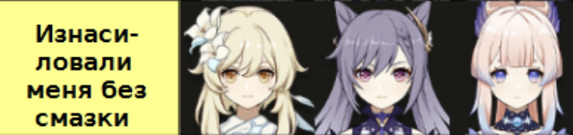 >>1321041 У меня была пачка Муалани Сян Лин Кадзуха(а потом Кадзуху заменила Часка) Беннет, было круто, за счет абилок муалани и часки ездил по карте. Но это давно было.