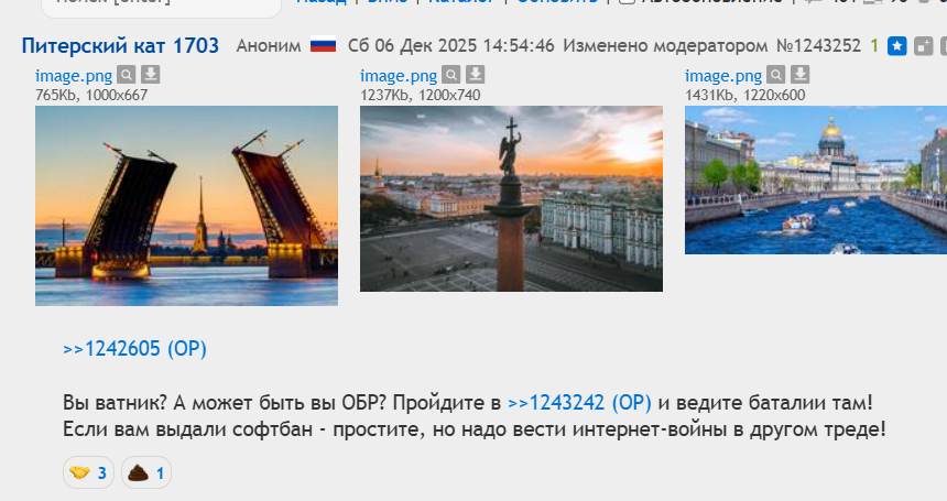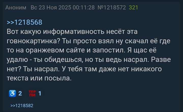Были сделаны абсолютно аполитиные перекаты в которых ласмово общались анончики, но озлобленный ватный дегенерат на модераторе порвался без причины и угнал тредики. Выдумывает какие-то свои правила, оскорбляет анонов и называет какими-то обрыгами.