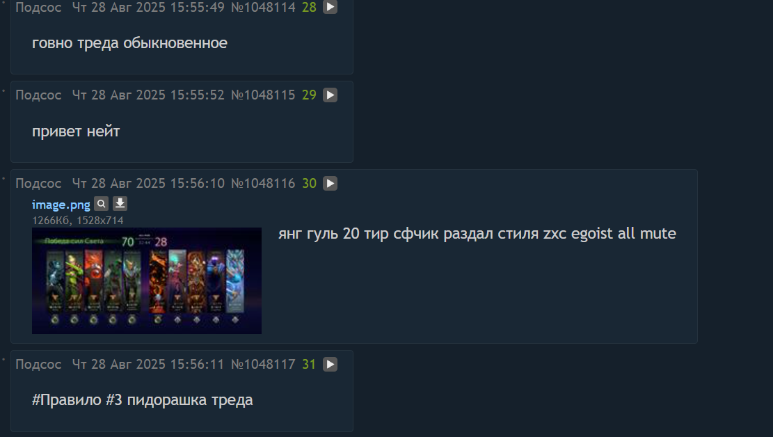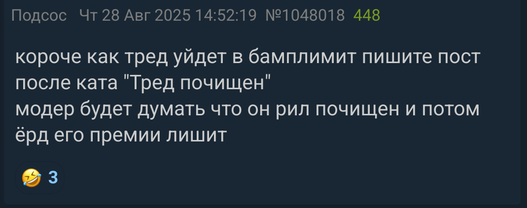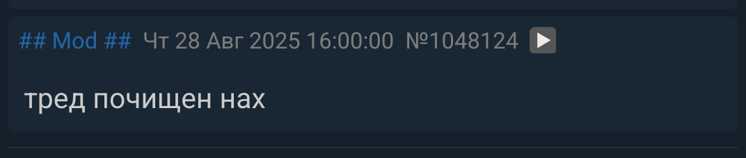 >>1048206 Это нужно, чтобы облегчить задачу других модеров. Он чекает конец треда, видит, что кто-то уже почистил и ему не надо всё это дерьмо заново перелопачивать, другой доброволец нашёлся. Чистить и закрывать надо обязательно, потому что кто-то постоянно в РКН доносит, при том предупреждения могут прийти за малейшую хуйню.